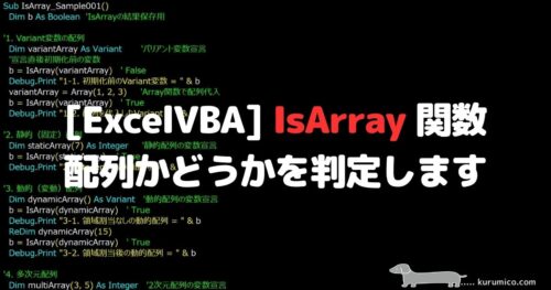 Excel VBA の IsArray 関数は、引数に指定した変数が配列かどうかを判定し結果を Boolean値で返します。