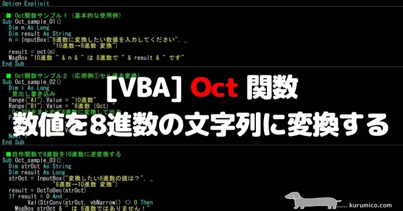 VBAには「8進数 → 10進数」に変換する組み込み関数がないため、独自関数(OctToDec)を作って変換する例を紹介します。