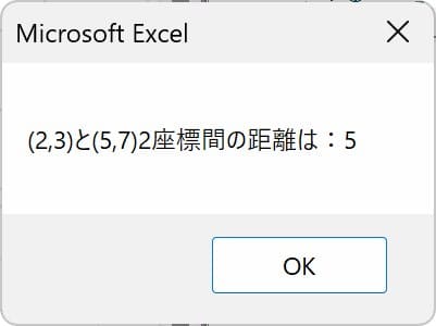 MsgBox "(2,3)と(5,7)2座標間の距離は:" & distance