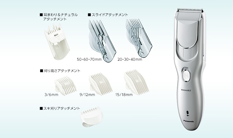 | 付属アタッチメント | ●刈り高さアタッチメント付(3・6mm用、9・12mm用、15・18mm用) ●スライドアタッチメント付(20~40mm用、50~70mm用) ●耳周り&ナチュラルアタッチメント付 ●スキ刈りアタッチメント付 |